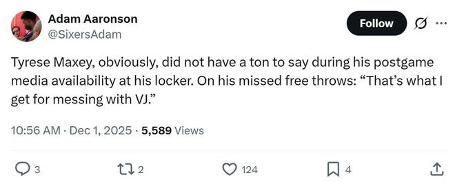 赛后谈及两罚不中,马克西说到:“这就是我招惹VJ埃奇库姆的下场。”