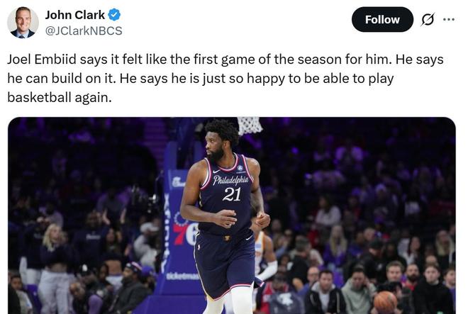 谈到本场复出,恩比德表示自己总是感到遗憾,但是运气这种事没办法,自己只能控制能控制的事情,也不会因为外界认为我不想出战而责怪他们。