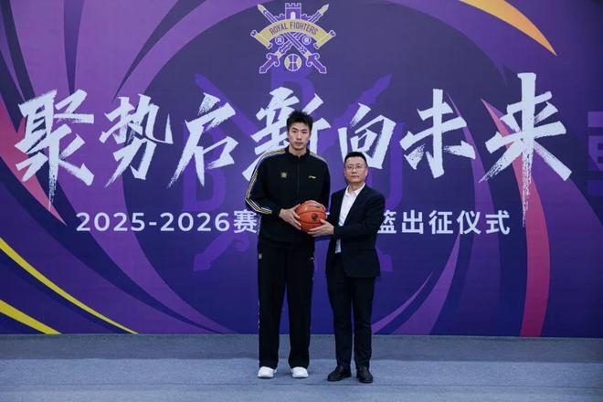 出征仪式上,北控集团党委副书记、工会主席杨治昌,向队长邹雨宸递交新赛季比赛用球。